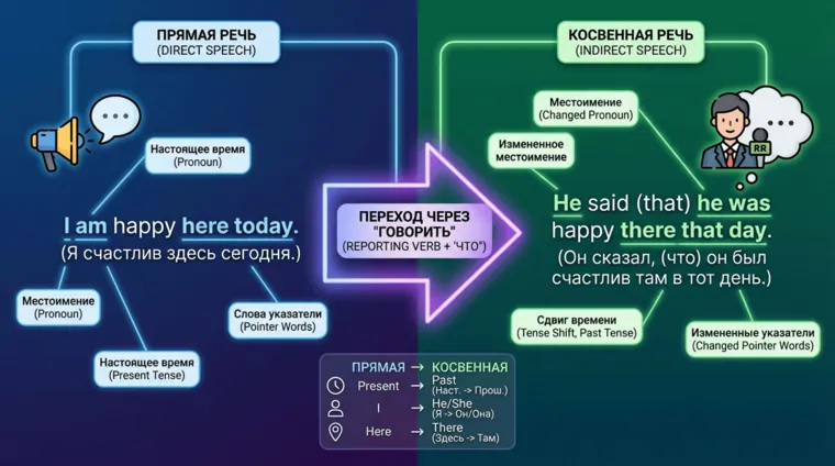 Как правило, между тем моментом, когда была произнесена исходная фраза, и тем, когда мы ее пересказываем, уже прошло некоторое время. На уровне грамматики это отражается в смене глагольного времени. Вкратце это правило indirect speech можно выразить так: